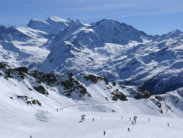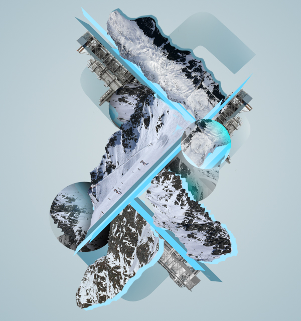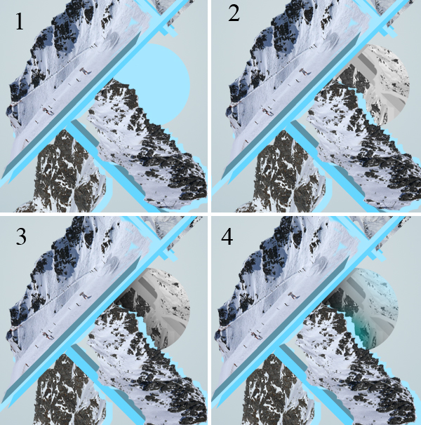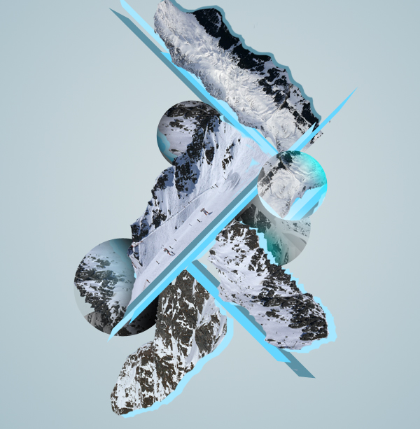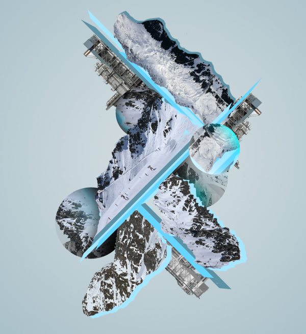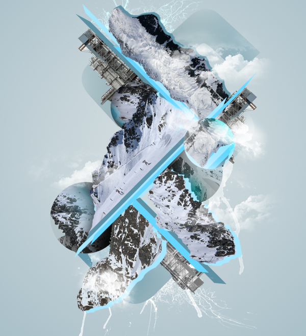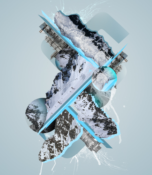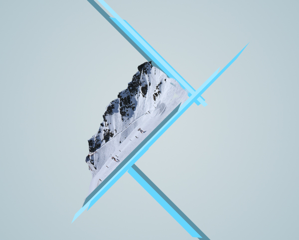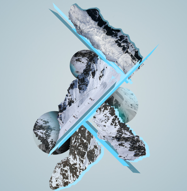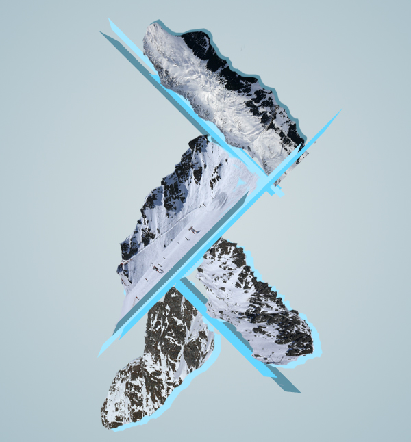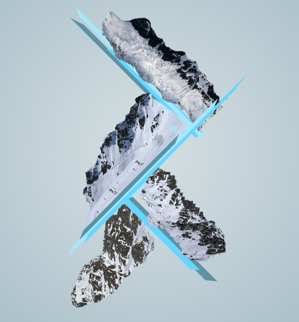 I’m quite happy with the base skeleton of this piece, so now it’s time to add some elements. With the theme of this piece being snowy, I decided to add some renders of snowy mountains. I chose a stock image of people skiing on the mountain. For you, a good choice would be stock with detailed mountains that are mostly snowy, but with a few rocks. A few rocks will add detail to the piece, while too many will make it too complicated. Avoid mountains that are just rocks or just snow. The stock I chose is from cgtextures.com. If you want to use this as a texture, I suggest you make an account there and download it yourself.