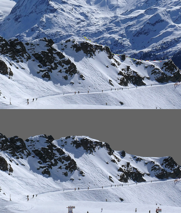 Take out the magenetic lasso tool and use the settings pictured below to render the mountain. Move the magnetic lasso tool without clicking along the edge of the mountain. The magnetic lasso should snap to the edges of the mountain. Next, create a selection of what you don’t want in your render, and hit delete. Erase the little bits that remain. The great thing about rendering mountains is that they’re meant to be rough and craggy, so a quick render in this case works and no real edge refining needs to be done. The outcome is clean-cut, as shown.