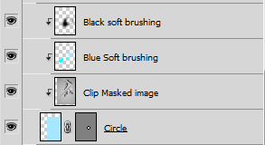 On the clip masked layer, go to Image > Apply Image and hit OK at the default setting. What you have showing in your circle is an image of the whole piece so far. I’m going to recycle the piece we have so far and use it to create new elements. I desaturate the clip masked image by hitting Ctrl + Shift + U, and move it around a little until it looks good. Next, create a new layer above the 2 layers you just worked with and also make this a clip mask. Grab a soft brush, size 300, make it black, and brush around the sides of the image. Create another clip mask layer on top, and then brush on some light blue colors. Use colors that match your piece.