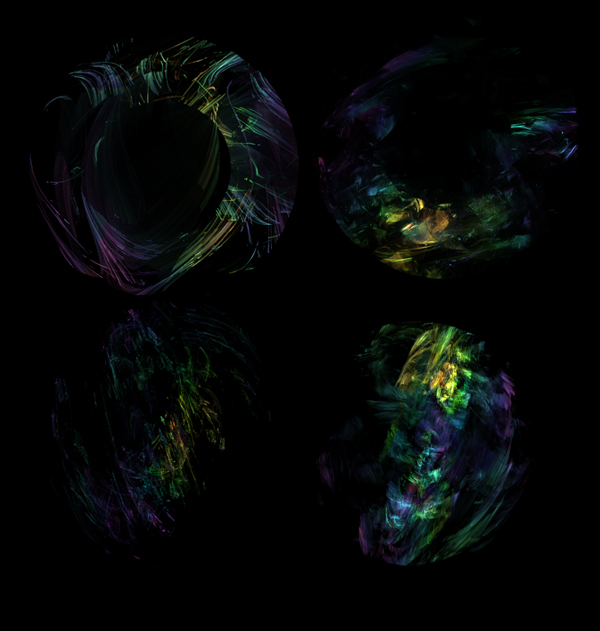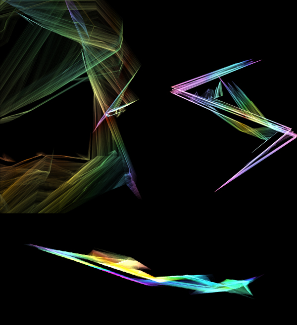I decided that more flashy effects were needed. By luck, I just finished creating a pack of fractals with ChaosScope. ChaosScope is open source software that generates colorful fractals. Below are some fractals I made with the software, which I then used in the piece. I simply desaturated the fractals by hitting Ctrl-Shift-U, and set it to a linear-dodge layer mode. The types of fractals I used are shown below. If you are generating your own fractals, be sure to use those with edges, and not smooth flowy fractals. You want to give the effects a sharp feeling.