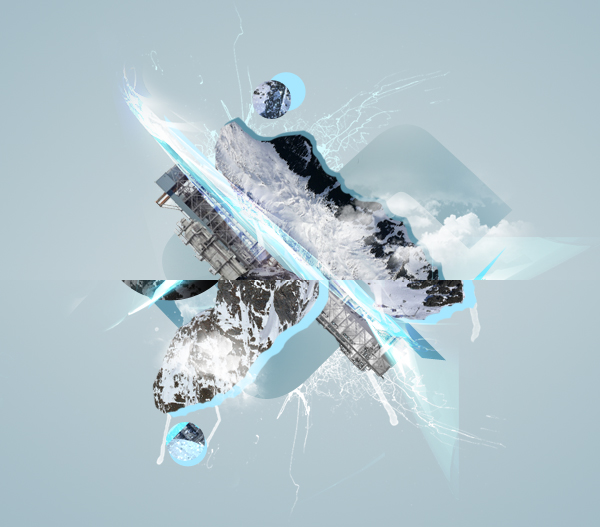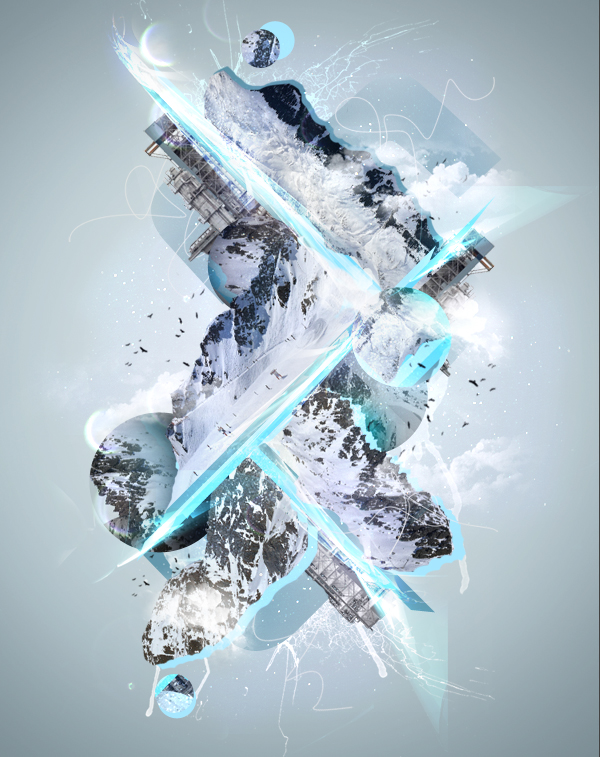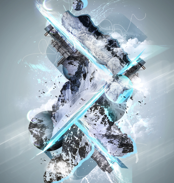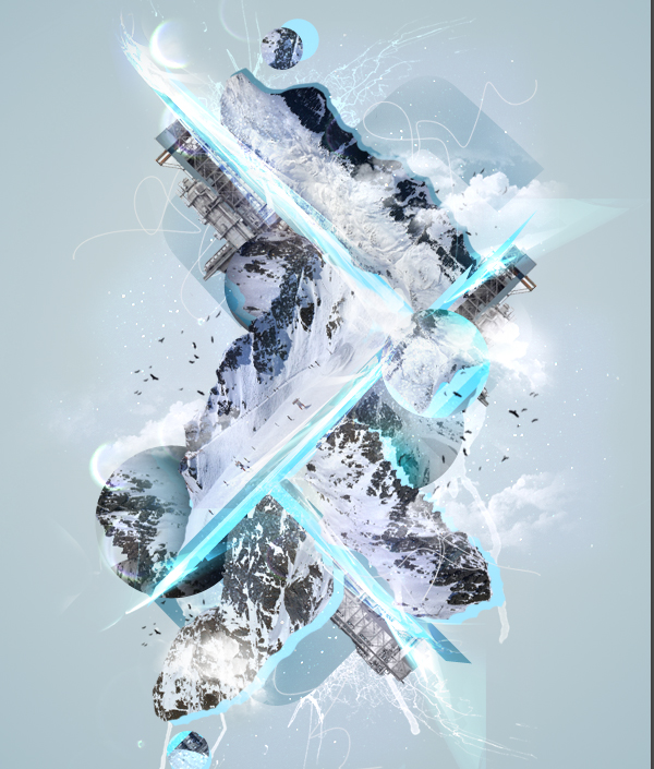 Effects serve the purpose of hiding the "rawness" of the piece, and in this case, it’ll turn a bunch of renders into an art piece. The piece has a snowy, icy atmosphere, but it’s missing something that goes hand in hand with cold mountains… clouds! I downloaded a great cloud brush pack from Deviant Art, by JavierZhX.