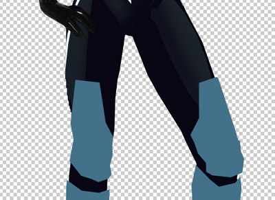 Add another layer above the skin for the material. Select the layer where the skin is and with the Magic Wand Tool click outside the empty area. Ctrl+Shift+I with invert the select so that you’ll have a shape of the skin area. Go into your new layer and fill the area with a dark blue. At this point you can color in the gloves as well. Set the Fill to 50% and the Blending Mode to Overlay and she should be close to finished. As a final touch I went to the skin layer and brushed in some black to blend in areas and add some shadow that would be present.