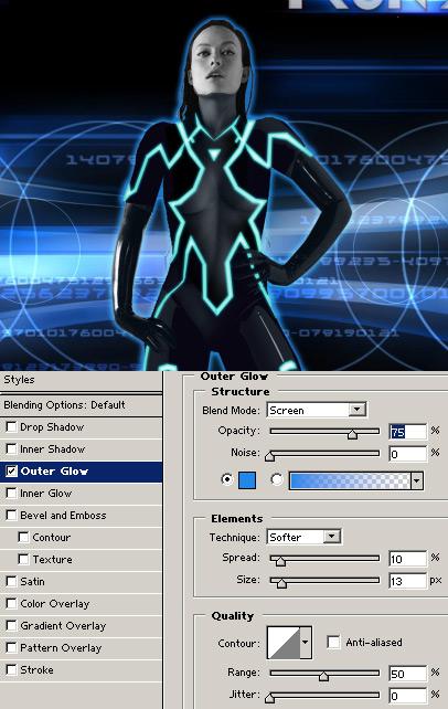A new Tron movie’s coming up and word on the net says Olivia Wilde has been attached to the project. I’m not sure what at what capacity she’s going to appear in the film, but I figure she’s more than deserving of getting the Tron treatment. In this tutorial I’m going to share some layer styles and blending modes that allowed me to achieve this effect.
