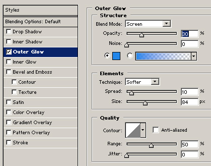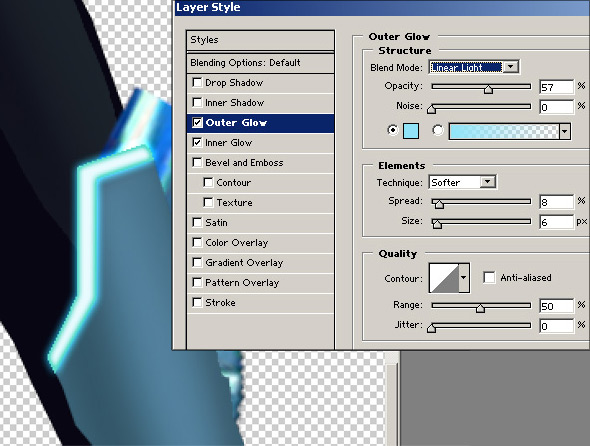 On the same layer, add another style with an Outer Glow. The color I chose for this is a bright blue #91E3F8. If you notice in the following pic I changed the blend mode in the actual style. In this case, to Linear Light: