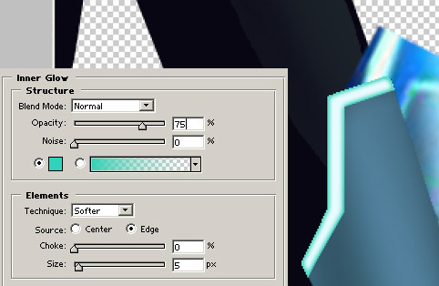 And at now the fun part! I’ve created this layer style so that no matter what shape you draw, it will have the Tron glow. Choose the light blue color #E8FAFE. You’ll be drawing in this color. I used the polylasso for this. Draw the trim along the top of her boot and then double click the layer you’re on. Choose the Inner Glow layer style, click the color box and use #30D2BA for a neon green-blue color, then use the following options: