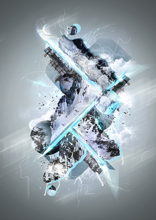 Effects serve the purpose of hiding the "rawness" of the piece, and in this case, it’ll turn a bunch of renders into an art piece. The piece has a snowy, icy atmosphere, but it’s missing something that goes hand in hand with cold mountains… clouds! I downloaded a great cloud brush pack from Deviant Art, by JavierZhX.Step 17