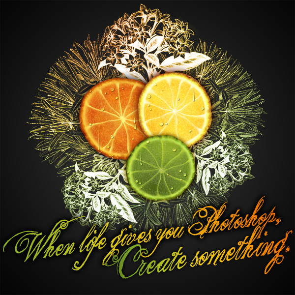 First, keep in mind that you can, of course, follow the above steps again to create more slices in various colors. I made a lemon and lime slice using the same technique as the orange. The nice thing about using Clouds as a main filter of any technique is that the result will be slightly different every time.Moving along here, I created a canvas at 1200 px by 1200 px. For the background, I made a radial gradient with black and dark grey. Then I placed the slices on the canvas, using Edit > Transform > Scale to alter sizes where needed. I also applied an Outer Glow around each slice. The Outer Glow was set to Multiply, with a Spread of 0, and a Size ranging from 20 px (for the lime) to 38 px (for the orange).