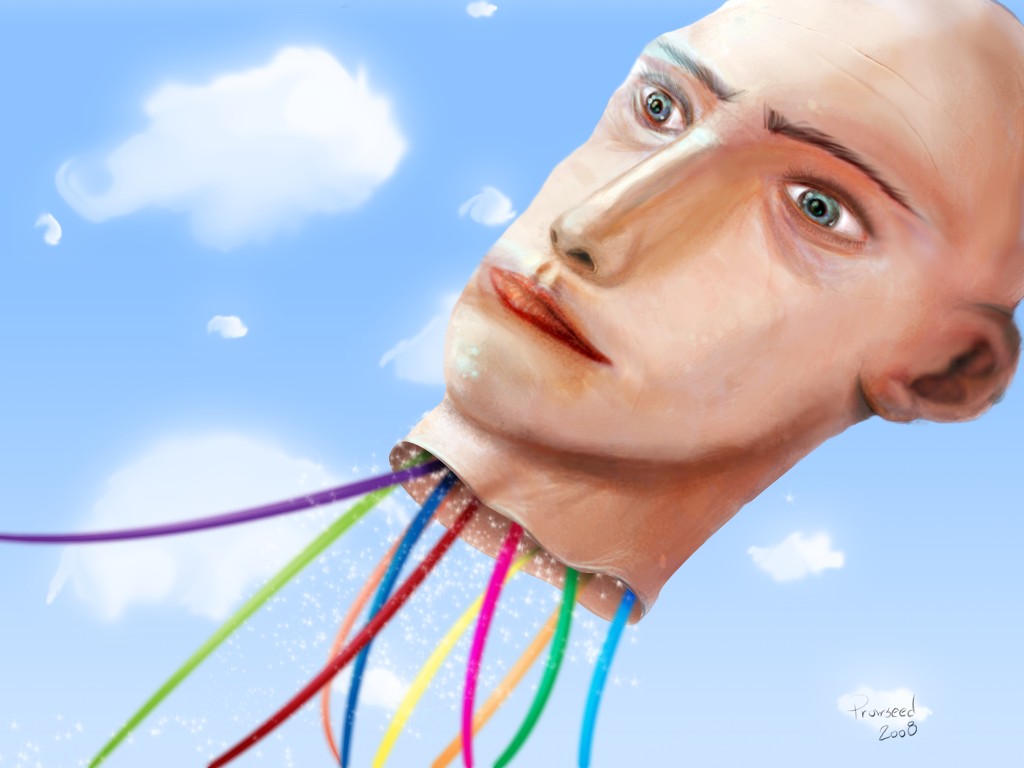 I’ll show you how to paint advanced constructions by combining basic shapes. The final image is a bold man’s portrait of a head flying in the sky. All painting will be done by mouse. All you need is pure Photoshop!